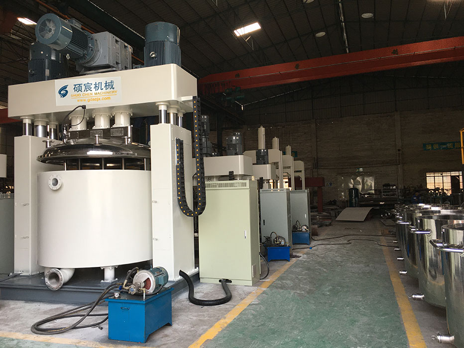 其中強(qiáng)力分散機(jī)(制膠機(jī))是硅酮密封膠、玻璃膠、結(jié)構(gòu)膠的生產(chǎn)設(shè)備中的主要組成部分,也是硅酮膠、玻璃膠的整條生產(chǎn)線中為重要設(shè)備部分。強(qiáng)力分散機(jī)是一種快速攪拌機(jī),有三個(gè)動(dòng)力驅(qū)動(dòng)的電動(dòng)機(jī),釜內(nèi)有三根不同形式、高低速結(jié)合的攪拌器;是一種應(yīng)用行業(yè)廣泛、密封性好、可抽真空、具有良好的脫泡效果、攪拌無(wú)死角、高低速結(jié)合、攪拌分散充分快速的混合攪拌設(shè)備。若想要了解更多的工況,您可以提出您所需要的處理量、設(shè)備形式、規(guī)格要求或您需要加工的物料的性質(zhì),根據(jù)您的情況碩宸的銷售工程師會(huì)提供讓您滿意的方案。